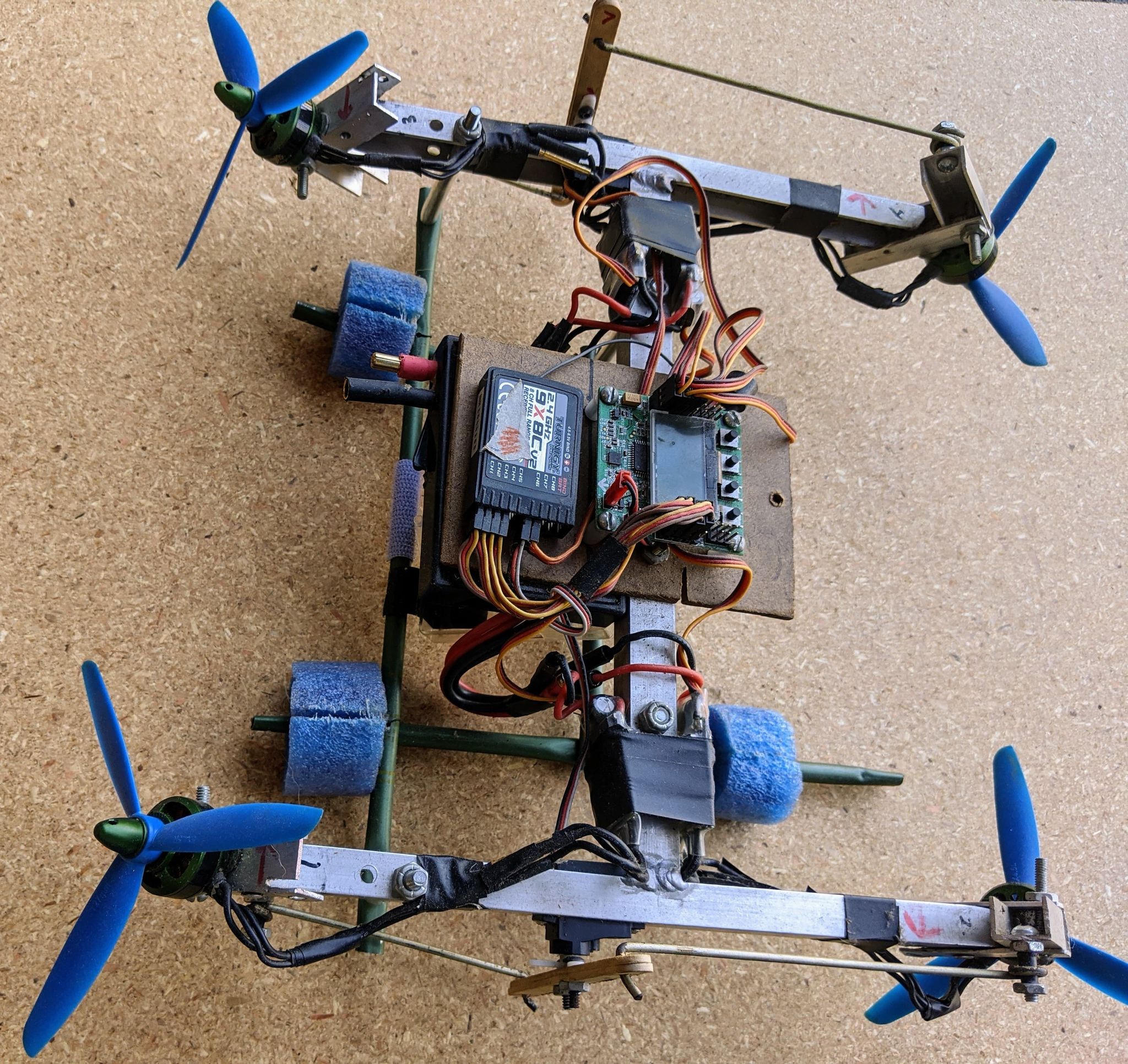 Building from the previous years experience creating a quadcopter, I set out to create a VTOL aircraft with servo tilted motors inspired by the V-22 Osprey. In the vertical position it operated as a standard quadcopter. Once in the air, the motor angle could be controlled with the back two motors pushing giving more efficient forward thrust. Foam airfoil created but not tested to date.