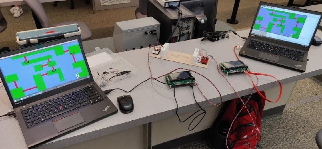 Player raceing game executes entirely on the STM32F769I dev board. Map rendered on laptop display using a USB serial connection and player inputs made through dev board touch screen. Opponent player position is communicated over pulsed laser interface.