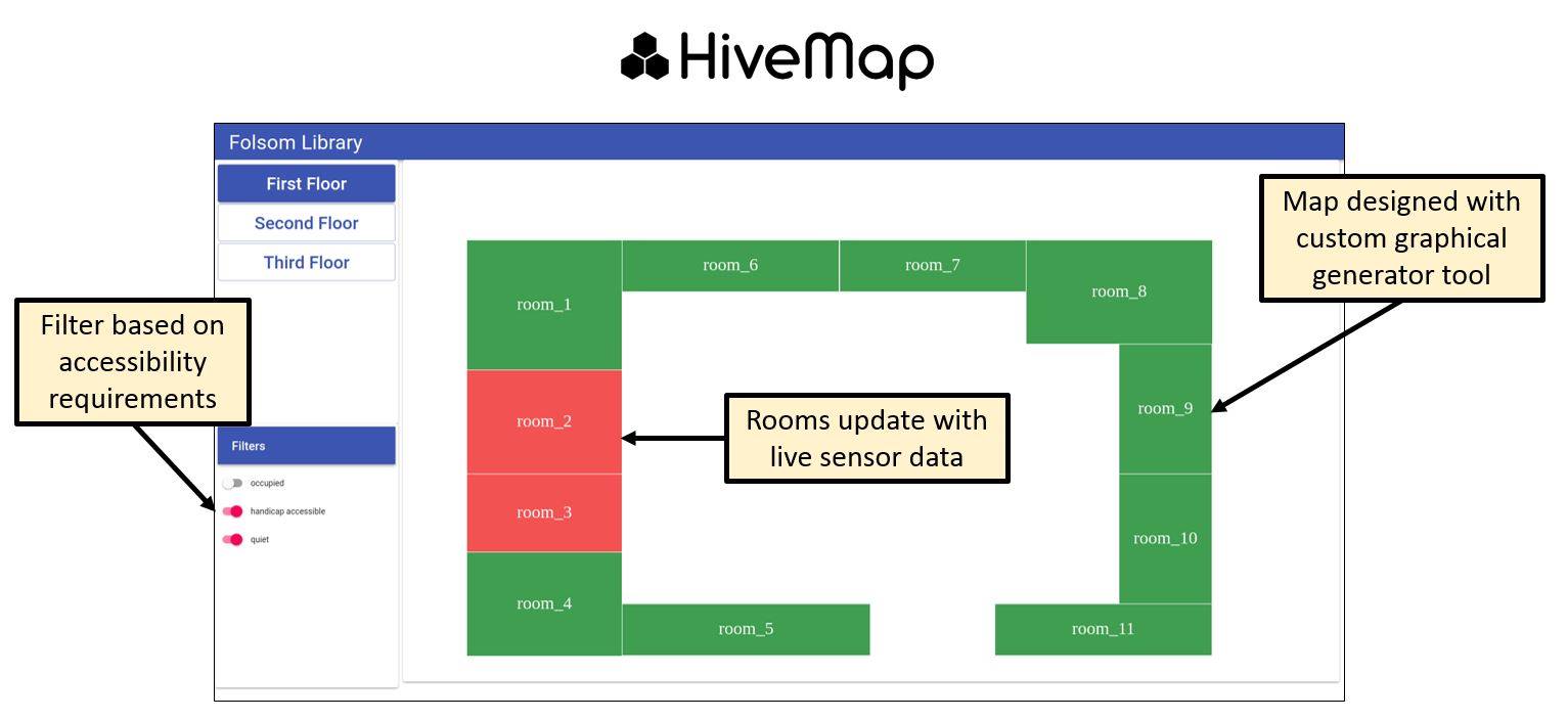 Distributed sensor network determines study room occupancy giving app users a UI to find open rooms. Rooms contains light, movement, & audio sensors that communicate via Bluetooth to determine occupancy. Each room sends status to central Raspberry Pi via WiFi.