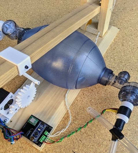 Variable airflow volume control and breath interval period set through GUI application. Outlet pressure plotted in realtime. Contains custom designed PCB, Python GUI, stepper motor controller, and a pressure feedback sensor.