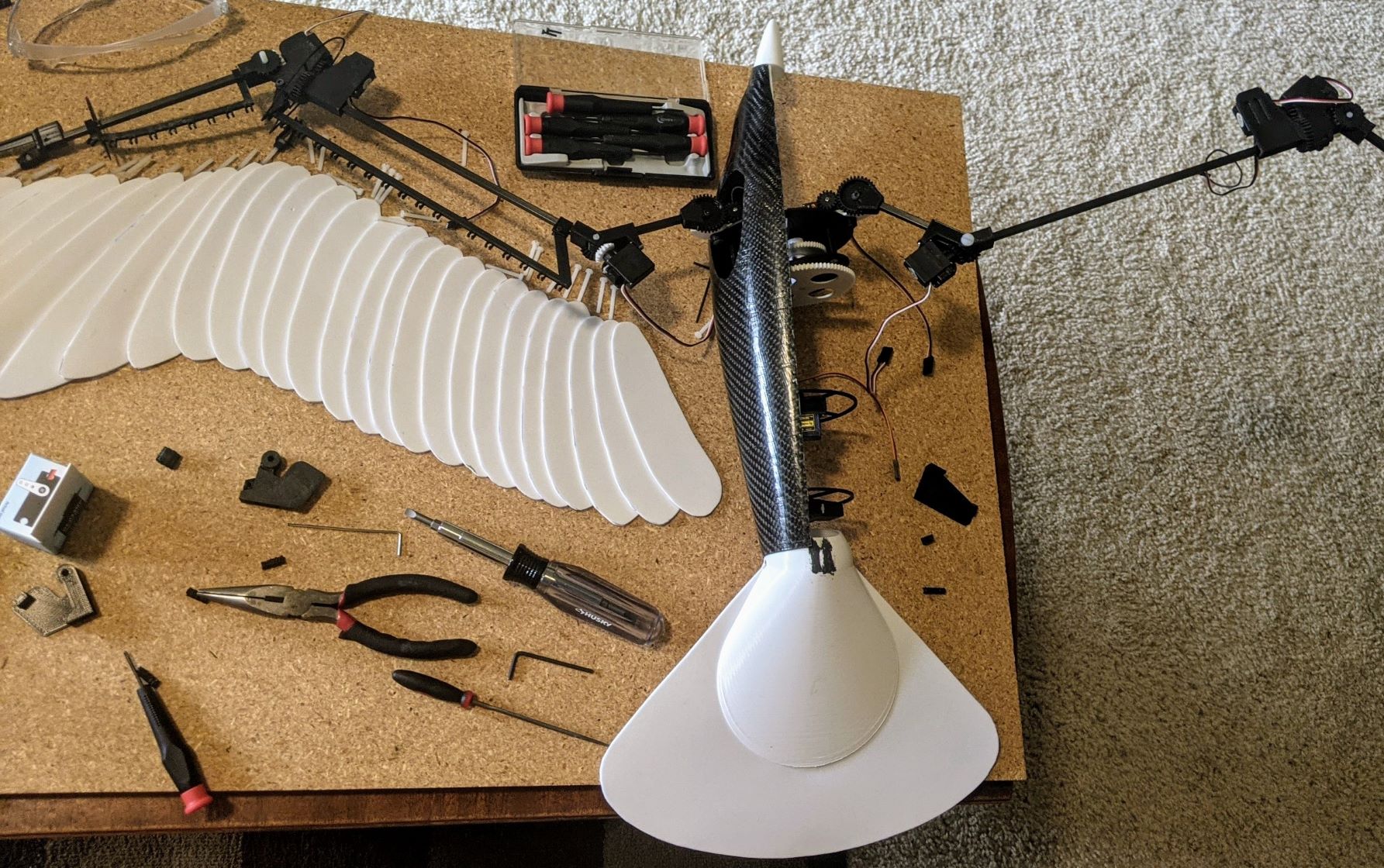 Goal is to create an operational mechanical bird that mimics the flight controls of a gull. Instead of props, thrust is generated through stepper motor controlled flapping with servo actuated wing joints.